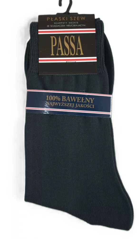 Skarpety męskie z wysokogatunkowej, miękkiej bawełny. Jednokolorowe, z wygodnym nieuciskającym ściągaczem.Skład: 100% bawełna.