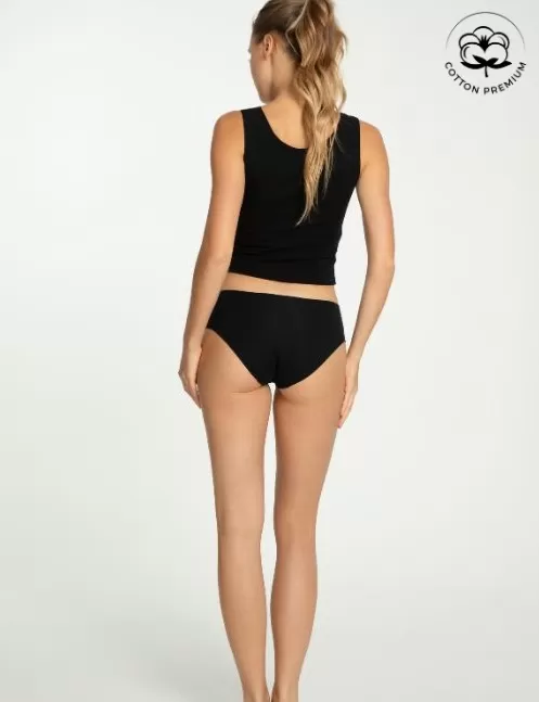 Figi bezszwowe o laserowo ciętych brzegach, nie odznaczają się pod ubraniem. Materiał odporny na strzępienia jest elastyczny w pionie i w poziomie co zwiększa dopasowanie do sylwetki. Skład: 85% bawełna, 15% elastan.