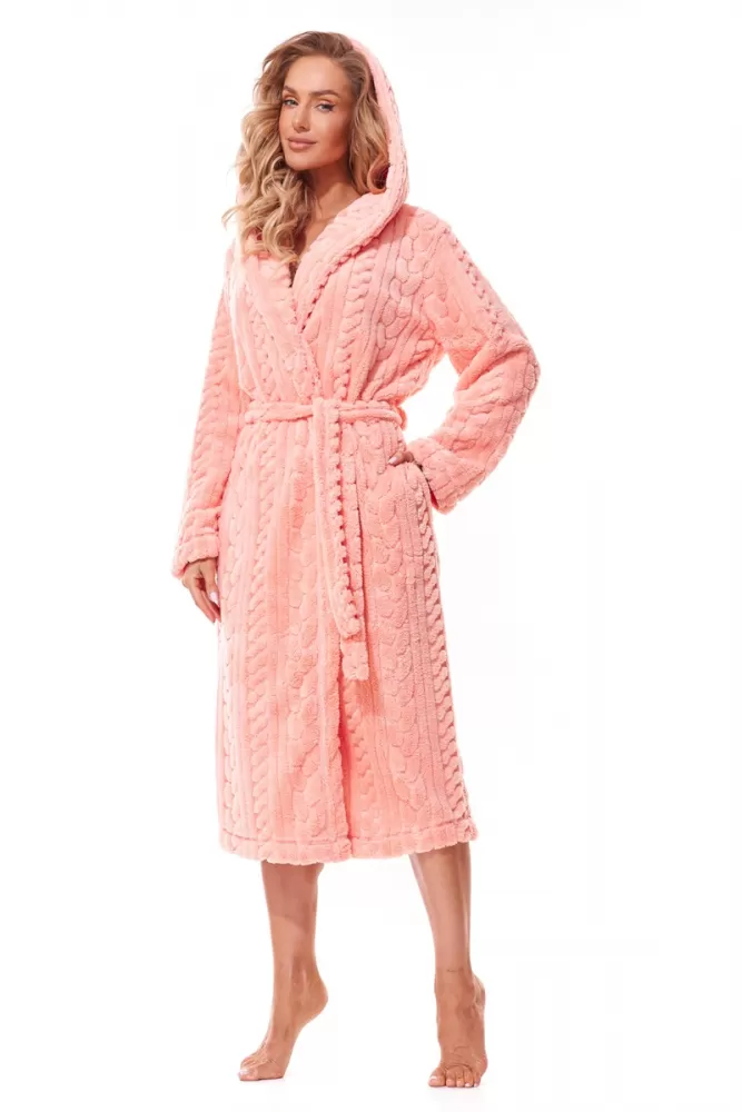 Piękny szlafrok damski długi z kapturem. Wzór pleciony warkocz. Bardzo miły i delikatny w dotyku. Skład: 100% poliester.
