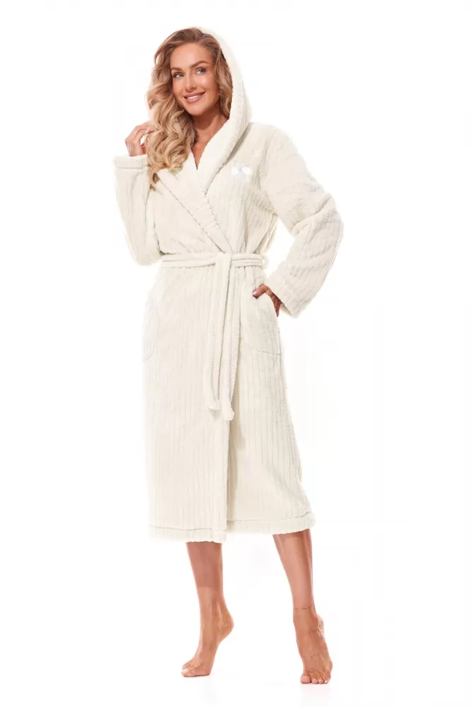 Długi szlafrok damski z kapturem wykonany z miękkiej dzianiny w prążek. Na wysokości klatki piersiowej aplikacja. Wiązany w pasie, po bokach kieszenie. Skład: 100% poliester.