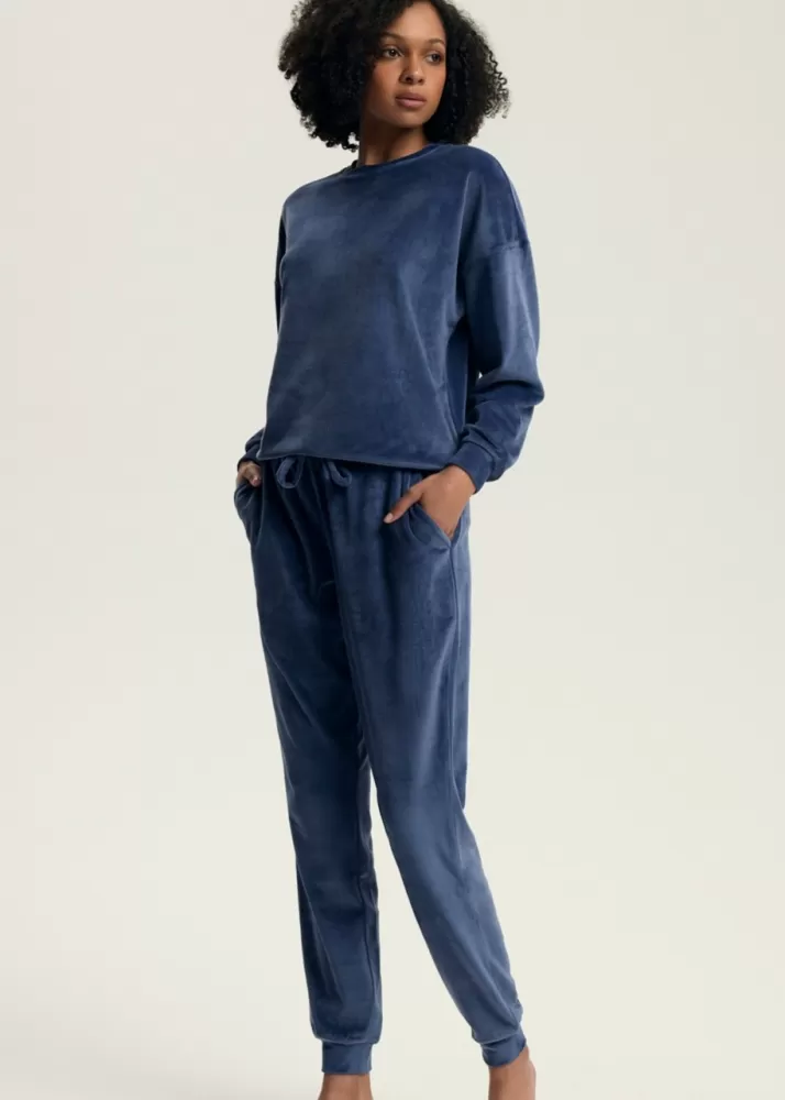 Welurow, luźny i wygodny dres damski. Bluza z długim rękawem i okrągłym dekoltem. Spodnie długie, jednolite. Dół bluzy, rękawy oraz nogawki zakończone ściągaczem. Skład: 95% poliester 5% elastan.