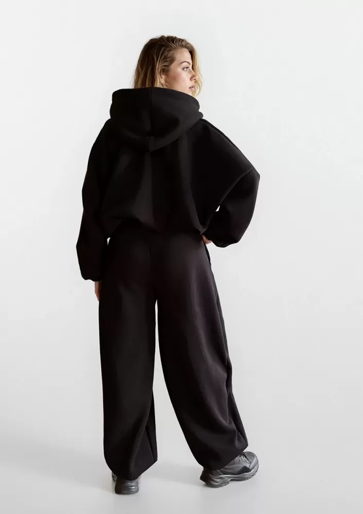 Dopełnieniem kompletu są spodnie o szerokich, wygodnych nogawkach zakończonych ściągaczem przy kostce. Taki krój gwarantuje maksymalną swobodę ruchów, jednocześnie zachowując modny i zgrabny wygląd. Wysoki stan oraz elastyczna talia pozwalają dopasować spodnie do sylwetki, podkreślając jej atuty i zapewniając wygodę przez cały dzień.