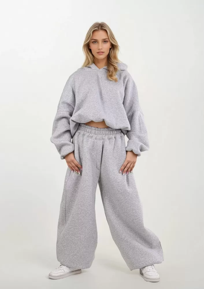 Dopełnieniem kompletu są spodnie o szerokich, wygodnych nogawkach zakończonych ściągaczem przy kostce. Taki krój gwarantuje maksymalną swobodę ruchów, jednocześnie zachowując modny i zgrabny wygląd. Wysoki stan oraz elastyczna talia pozwalają dopasować spodnie do sylwetki, podkreślając jej atuty i zapewniając wygodę przez cały dzień.