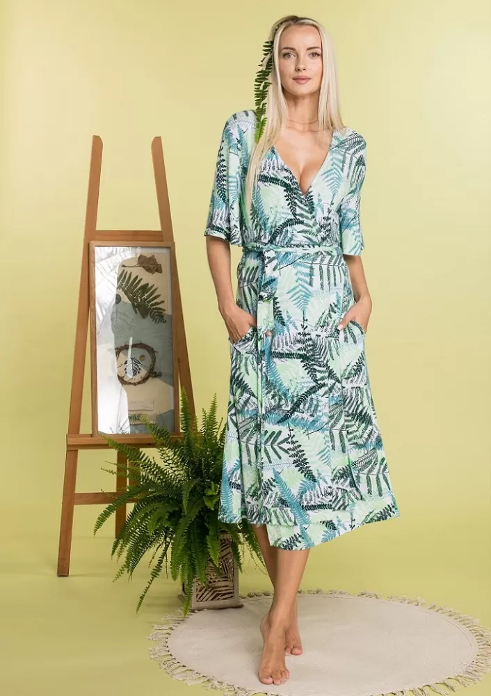 Sukienka damska kopertowa wykonana z wzorzystej, wiskozowej dzianiny. Krótki rękaw typu, wiązana w pasie. Dekolt w szpic - możliwość zakładania tył na przód. Na wysokości bioder wygodne kieszenie.